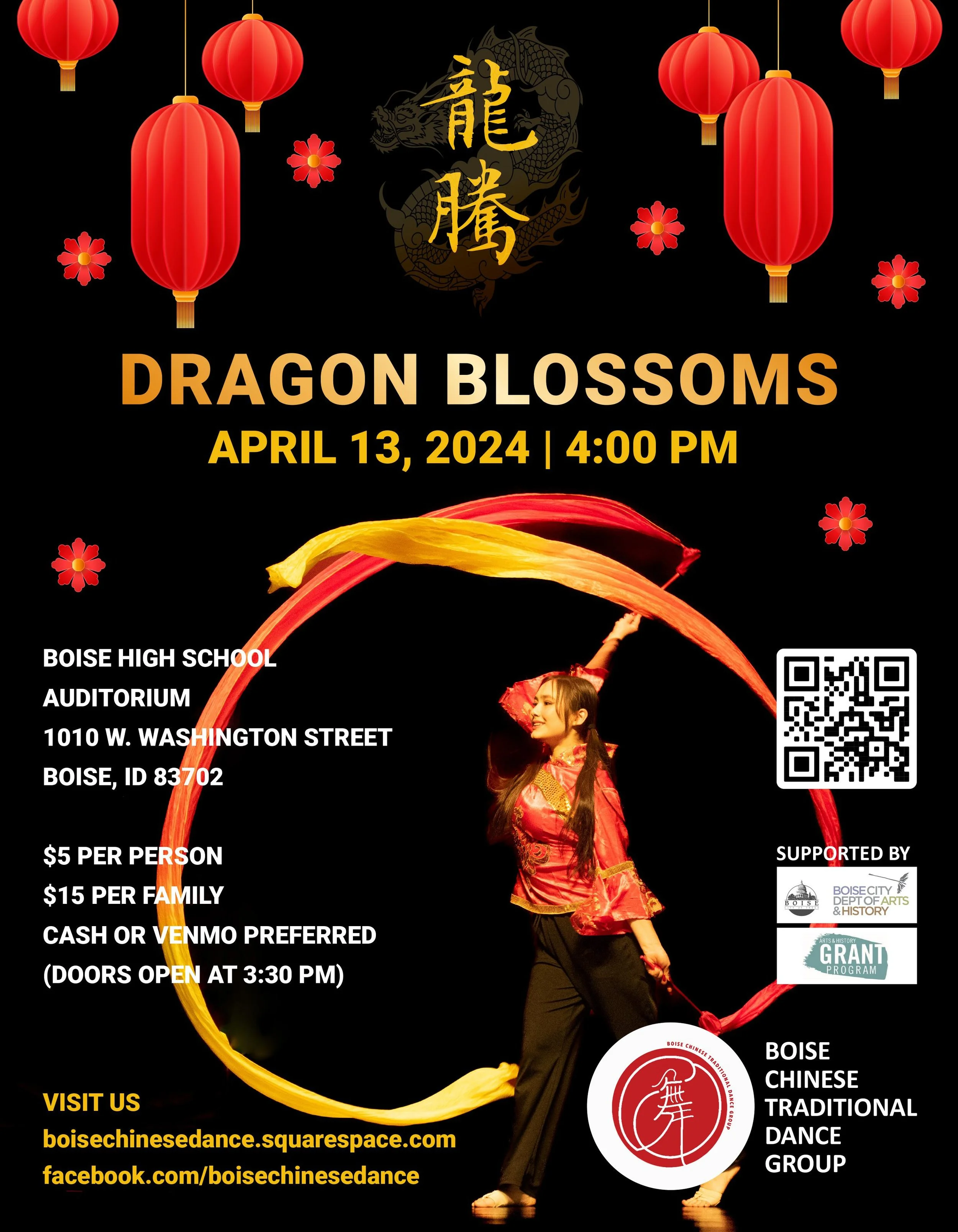 Join us at 4:00pm on April 13th at the Boise High School Auditorium for our second annual showcase: Dragon Blossoms. Celebrate the year of the dragon with these ethnic and classical dances that explore the vast and diverse Chinese culture. $5 entry fee, $15 per family.